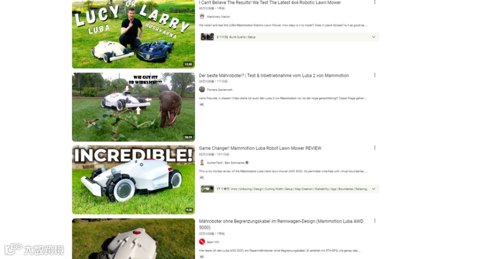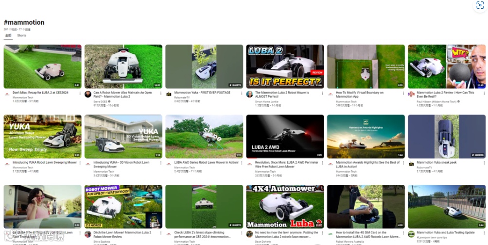 在YouTube上,Mammotion的官方账号收获有4750的订阅,发布内容主要为产品的宣传视频,在五个月前Mammotion在YouTube号发布的一条新产品LUBA 2割草机器人的视频,其播放量截止到现在已经达到263万。证明其除了与网红KOL合作带来视频流量外,产品与品牌本身在YouTube上的声量与知名度。