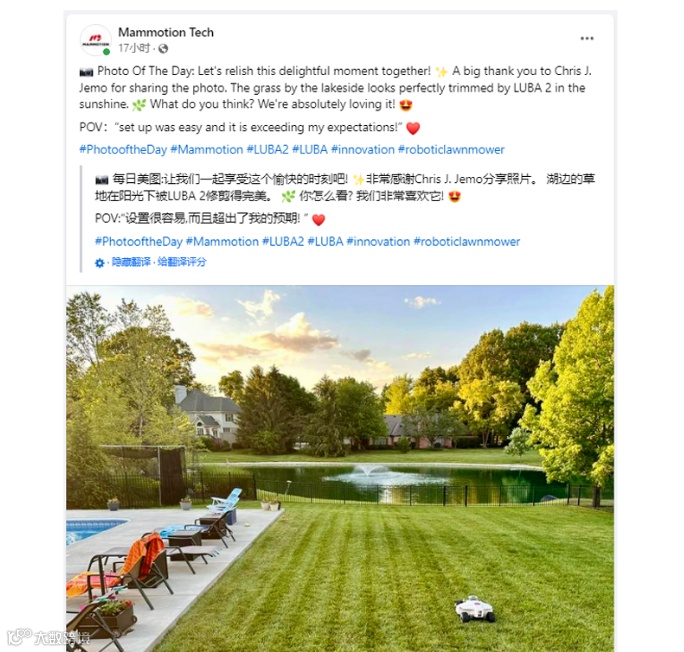 Mammotion在Facebook目前的订阅用户达到8.1万,在Facebook的简介中放置有独立站链接,此举有利于通过社媒向品牌网站引流,Mammotion在Facebook的账号很活跃,主要发布内容为产品展示、营销活动推广等,并且还会发布一些消费者反馈的UGC内容,这样可以拉进与消费者的距离,增加品牌好感。