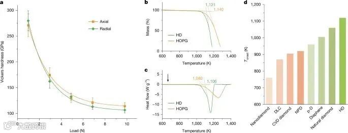 图4 | 力学与热学性能测试,表明六方金刚石具有超过100 GPa的硬度以及优异的热稳定性
