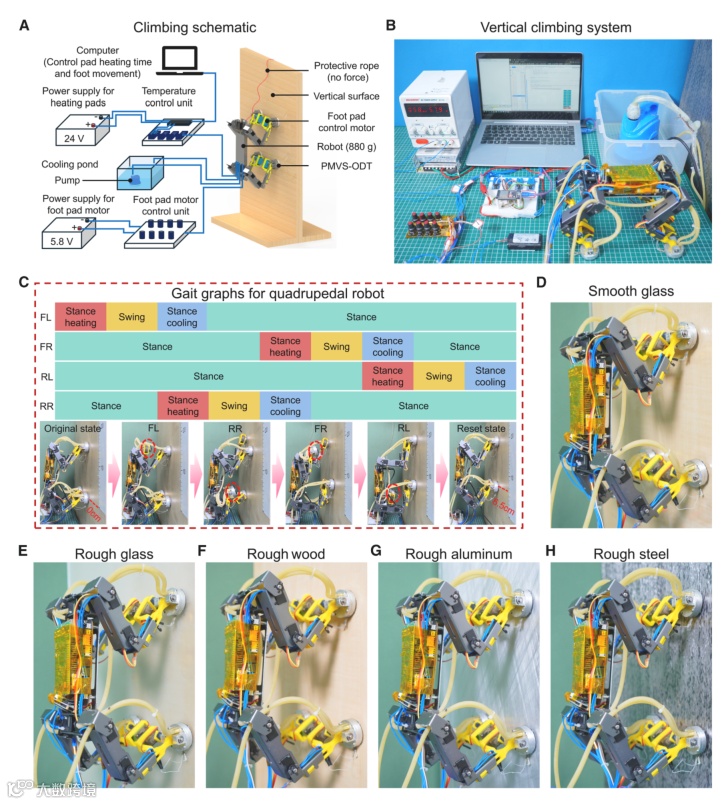 最终,研究团队将PMVS-ODT足垫集成至一台重880克的四足表面自适应机器人上,展示了其实际应用潜力(图5)。机器人足部集成了独立的加热与冷却模块,通过程序化控制实现粘附与脱附。在一个攀爬周期中,机器人按照“左前-右后-右前-左后”的顺序移动足部,每步可向上行进约6.5厘米。实验视频证实,该机器人能够成功地在垂直的光滑玻璃、粗糙玻璃、粗糙木材、粗糙铝合金和粗糙钢材表面稳定攀爬,甚至能悬挂于铝合金天花板下方,充分证明了其基于PMVS-ODT粘附剂的强大环境适应能力。