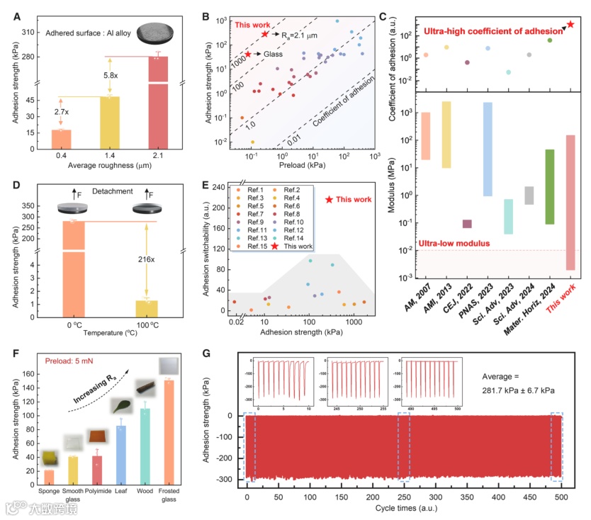 图4 | PMVS-ODT的粘附性能 (A) 在5 mN预压力下,PMVS-ODT在不同粗糙度铝合金表面的粘附强度。 (B) 仿壁虎粘附剂的预压力及其对应粘附强度的比较(数据点颜色随粘附强度增加按黄、红、紫、蓝、青依次变化。对应数据列于表S1)。 (C) 刚度可调粘附剂的刚度可调范围与粘附系数的比较(数据列于表S2)。 (D) 从0°C到100°C的粘附开关特性。 (E) 粘附可切换材料的粘附强度与粘附开关比的比较(数据列于表S3)。 (F) 在5 mN预压力下,PMVS-ODT在不同基材上的粘附强度。 (G) PMVS-ODT在温度变化下,经过500次粘附循环后粘附强度的变化。