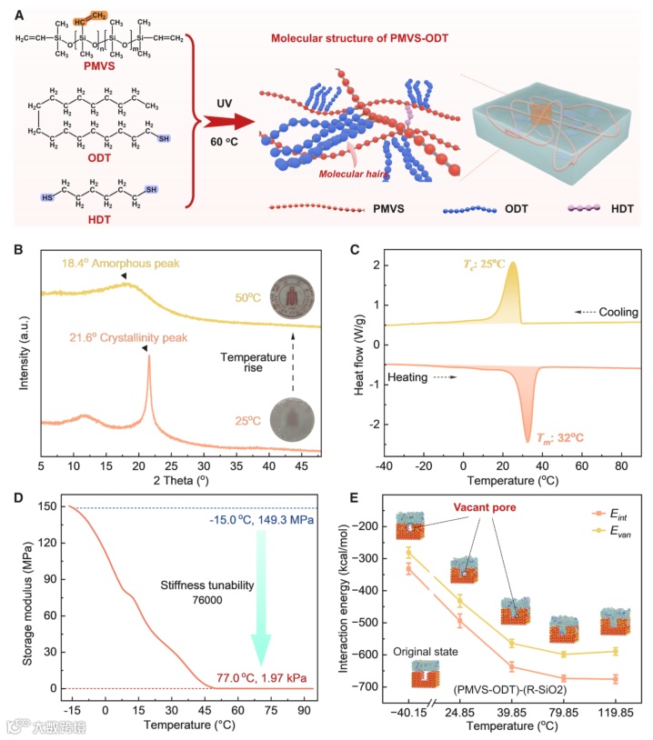 PMVS-ODT的合成路径简洁且可规模化,其粘附机理通过实验和分子动力学模拟得到深入揭示(图3)。合成过程基于硅氧烷的开环聚合和高效的硫醇-烯点击化学反应。差示扫描量热法和X射线衍射证实了ODT侧链在25°C以下结晶、32°C以上熔融的可逆相变行为,这是材料模量可大幅调控(刚度可调比达76,000)的基础。动态力学分析表明,其储能模量可从-15°C时的149.3 MPa变化至77°C时的1.97 kPa。分子动力学模拟进一步阐明,在高于熔点的温度下,PMVS-ODT的分子链能够有效填充粗糙二氧化硅表面的纳米级凹槽,实现微观共形接触。当温度从高温降至0°C时,界面间的相互作用能显著降低,表明形成了稳定且能量更低的粘附界面,这归因于分子链构象的调整和与基底更紧密的结合。