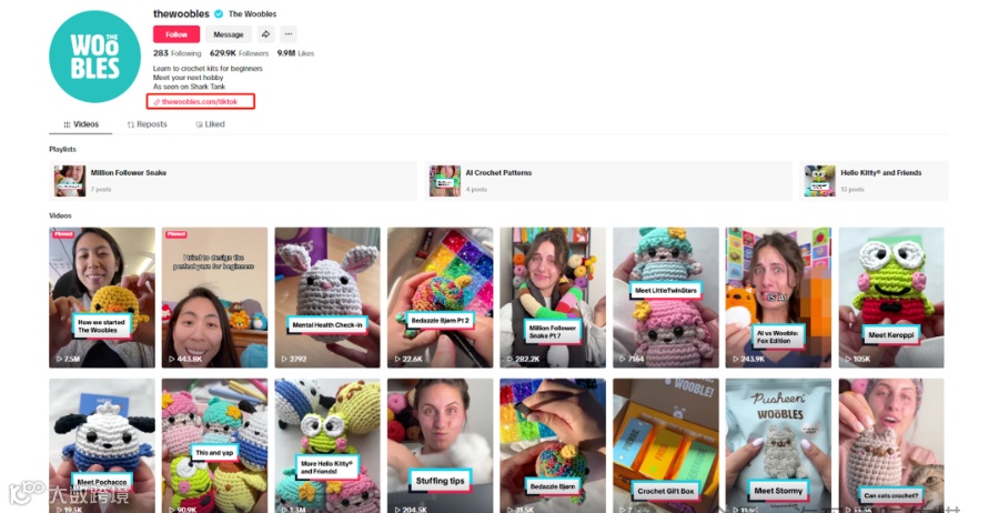 早在2022年4月,The Woobles就已经入驻TikTok,目前The Woobles在TikTok上收获有62.9万的订阅,总视频点赞量也达到百万级别,The Woobles还利用TikTok为品牌的独立站进行引流,实现了TikTok Shop之外的完整销售闭环。