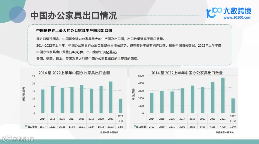 亚太地区是全球办公家具市场的主要市场之一,占全球市场份额的33%。中国是全球办公家具最大的生产国及出口国,2022年上半年度中国办公家具出口数量为510万件,出口金额为15.77亿美元。美国是北美地区的主要市场,办公家具需求稳定且购买力高。欧洲市场则主要由Steelcase、Herman Miller Europe等品牌主导。