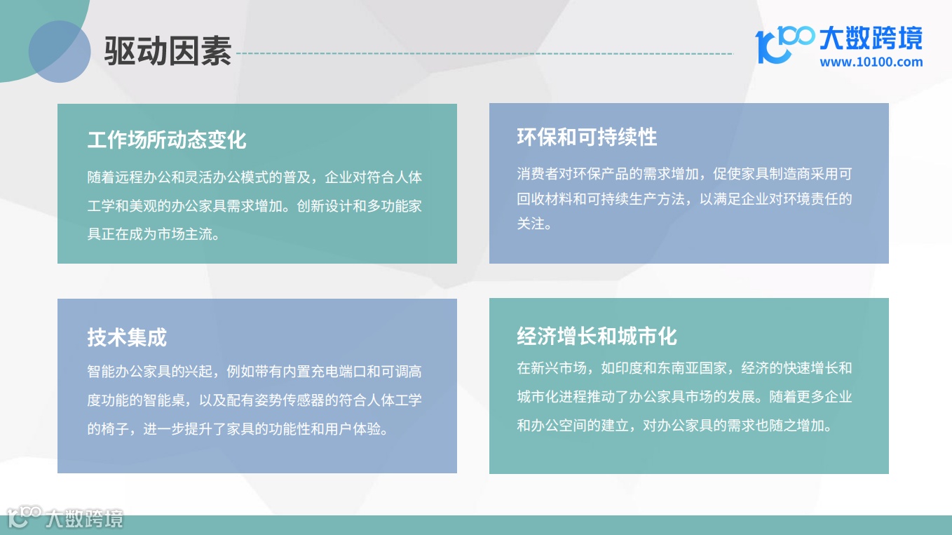 数跨境通过对全球办公家具市场的细致梳理和科学预测,为企业提供了宝贵的市场洞察和战略方向建议。随着技术的不断进步和消费者偏好的演变,新的机遇和挑战将不断涌现。企业需要关注环保和可持续发展的趋势,在产品设计和生产过程中融入更多的绿色理念,以提升市场竞争力。
