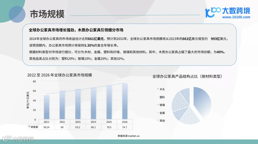 根据大数跨境的数据,2024年预计全球办公家具市场将继续保持增长趋势。市场规模预计将达到74.7亿美元。办公家具市场的增长主要得益于商业环境的扩展、翻新改造项目的增多、贸易政策的支持以及跨国公司的增加。随着灵活办公和家庭办公的普及,市场对符合人体工学且美观的办公家具需求日益上升。