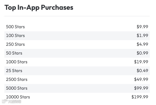 data.ai数据显示,Tevi并没有采用订阅收费,内购项目仅为购买星星(应用内货币),用于互动、打赏等等。不同数量的星星从0.49美元至199.99美元不等,但单价算下来并没有区别太大。从定价来看,对于新手较为友好,便于初期尝试低价的套餐。从数据来看也印证了这一点,大多数用户选择的套餐都在10美元以内。