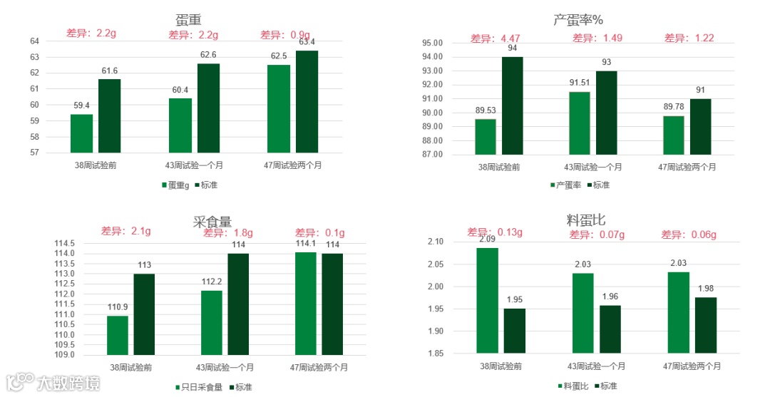 经过两个月的试验,蛋重与产蛋率与标准改善较多,逐步接近标准,采食量已经恢复到标准,料蛋比显著降低,整体经济效益得到提升。