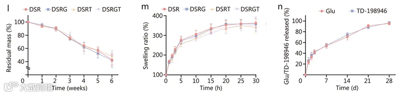 缓释与降解:DSRGT在PBS中28天内实现Glu与TD-198946平稳释放,前3天快速释放42.26±3.67%,21天累积释放89.85±2.98%,28天达95.94±2.59%;降解实验显示6周内残留质量45.28±8.85%,降解速率匹配COs发育周期,避免过早失去支撑或长期残留。