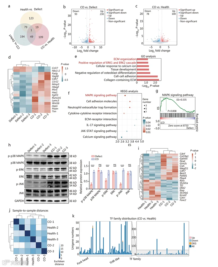 机制验证:Western blot显示CO组p-p38(38 kDa)、p-ERK(42 kDa)、p-JNK(46 kDa)蛋白表达显著升高,证实MAPK信号通路激活是软骨再生的关键机制;加入ERK抑制剂PD98059后,COs的ACAN、ColⅡ表达显著降低,进一步验证通路作用。