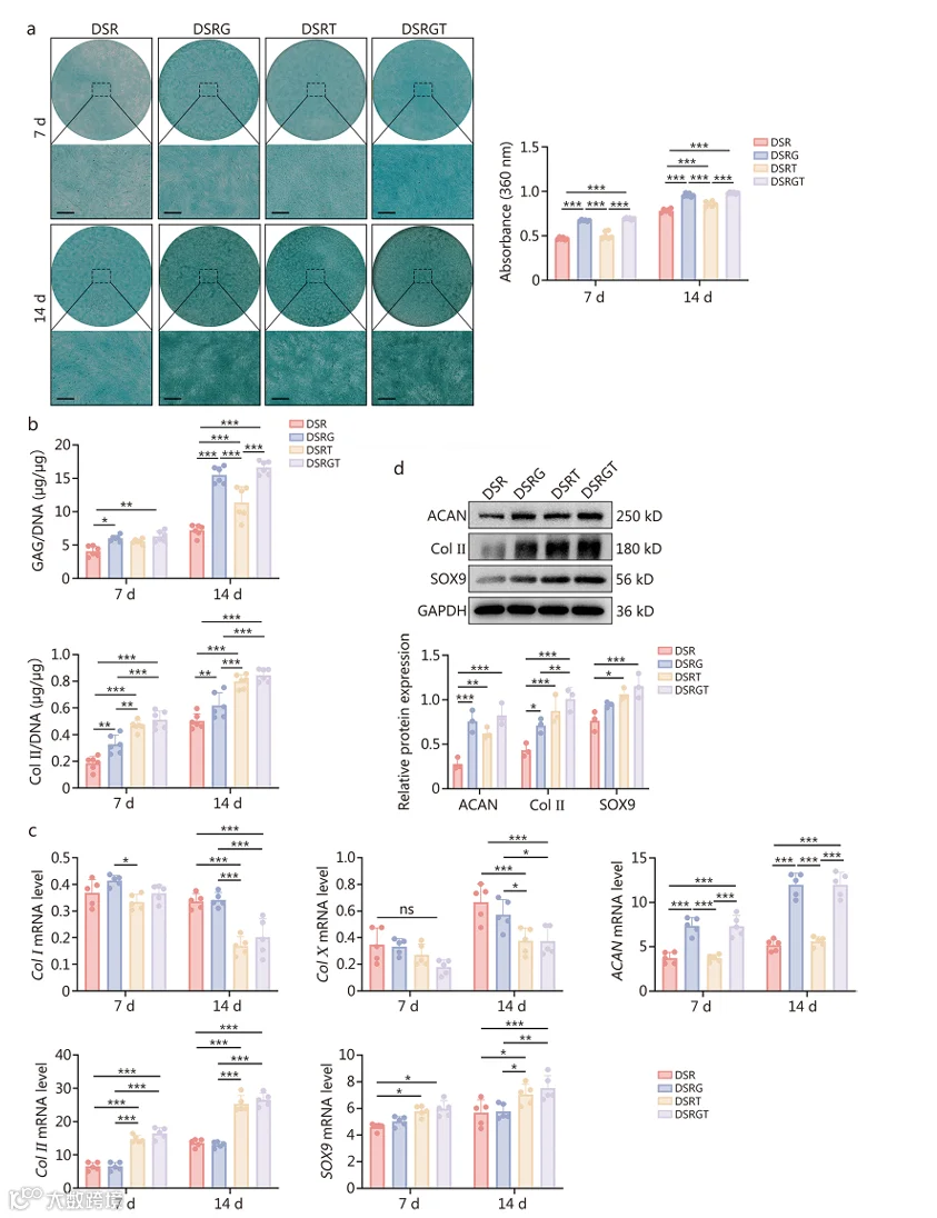 基质合成检测:阿尔新蓝染色显示,DSRGT组7、14天成软骨诱导后糖胺聚糖(GAG)染色最强;DMMB法与ELISA定量证实,14天时DSRGT组GAG含量(归因于Glu)与ColⅡ含量(归因于TD-198946)显著高于其他组。