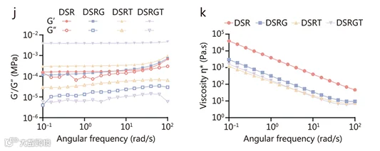 力学与流变性能:频率扫描显示DSRGT的储能模量(G′)始终高于损耗模量(G″),呈现典型水凝胶弹性特征;剪切变稀行为(黏度随剪切应力降低)利于3D打印,且PEG分子引入使黏度适度降低,提升打印流畅性。