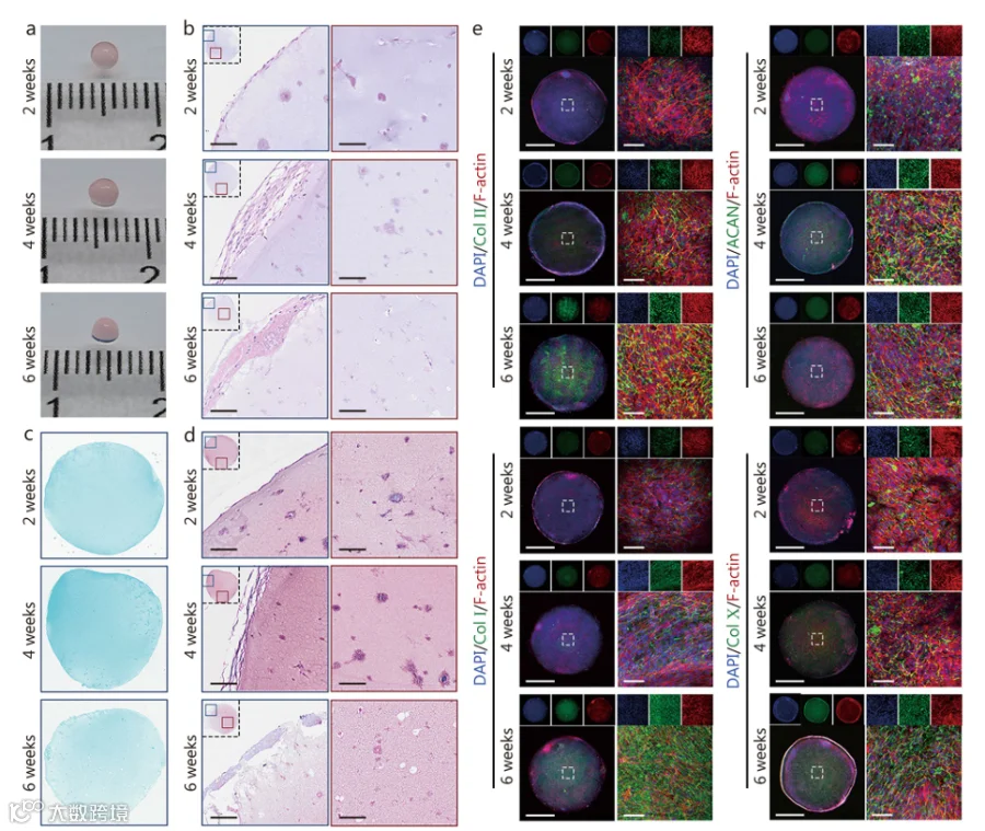 形态与染色分析:1周龄COs无明显形态变化,SOX9表达强(早期成软骨标志);2周龄表面细胞致密,4周龄形成多层结构,GAG含量最高(阿尔新蓝与番红O/固绿染色最强);6周龄因药物释放完毕、营养交换受阻,内部出现凋亡空泡。