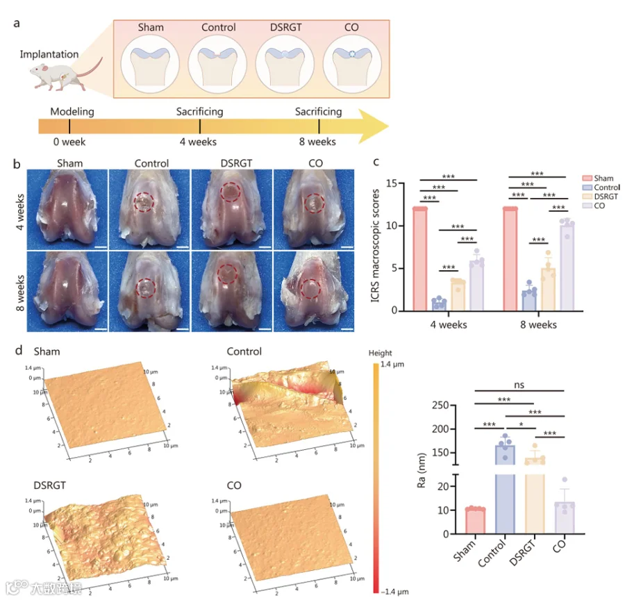 宏观与表面性能:8周时CO组缺损填充完整,表面光滑(ICRS评分10.08±0.79),原子力显微镜(AFM)显示表面粗糙度(Ra)与Sham组无显著差异,显著低于对照组与DSRGT组。