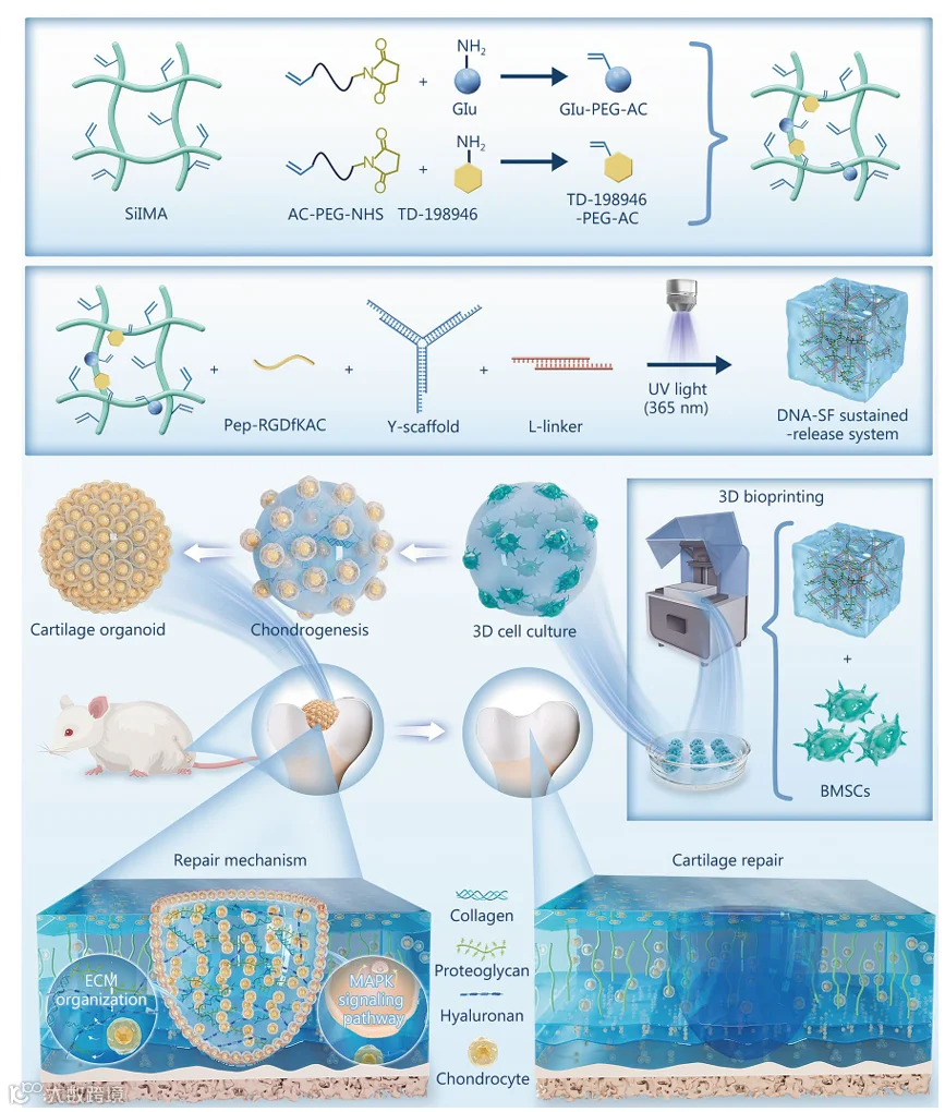 本研究基于甲基丙烯酰化丝素蛋白(SilMA)水凝胶,通过丙烯酰化聚乙二醇NHS酯(AC-PEG-NHS)共价接枝葡萄糖胺(Glu)与TD-198946,构建DNA-丝素蛋白(DNA-SF)水凝胶缓释系统(DSRGT),结合投影式光固化生物3D打印技术,实现骨髓间充质干细胞(BMSCs)定向分化为毫米级软骨类器官(COs)。