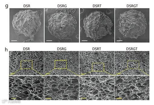 形态与孔隙:FE-SEM显示DSRGT呈均匀多孔结构,表面与内部孔隙连通,孔隙率56.44±3.88%,孔径277.6±18.75 μm,利于细胞黏附与营养交换;与DSR(无Glu/TD-198946)、DSRG(仅含Glu)、DSRT(仅含TD-198946)相比,孔隙参数无显著差异,证明接枝分子不破坏网络结构。
