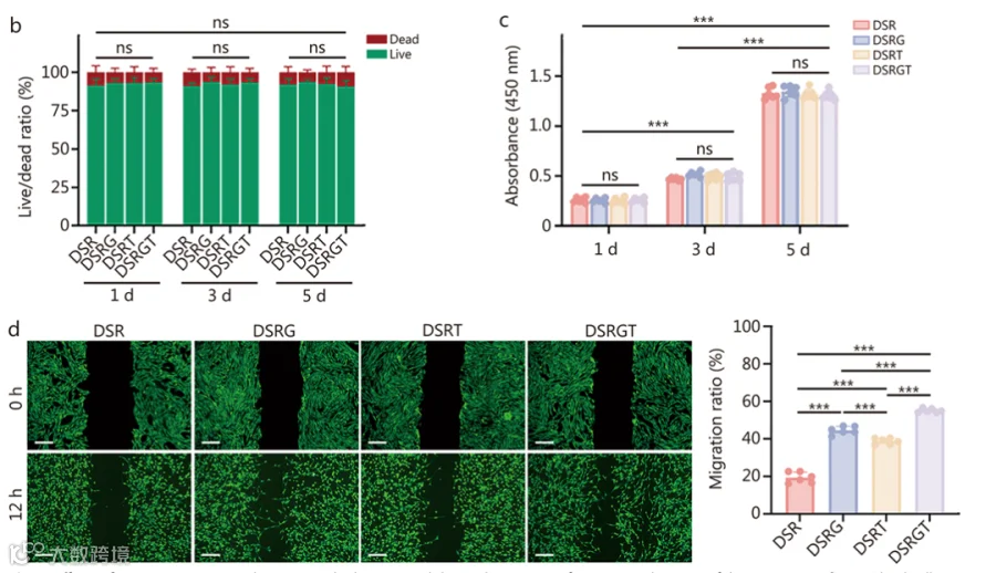 活死染色:BMSCs与DSR、DSRG、DSRT、DSRGT共培养1、3、5天,活细胞比例均> 90%,死细胞极少,各组无显著差异,证实水凝胶无细胞毒性。
