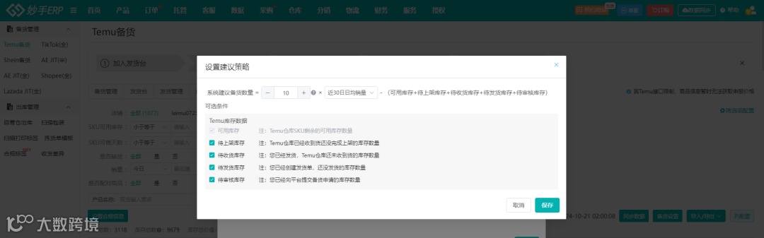 关于备货数量,卖家朋友可以直接在妙手-【托管】模块-TEMU备货-备货设置中,开启建议备货数,并根据公式自定义设置备货策略。
