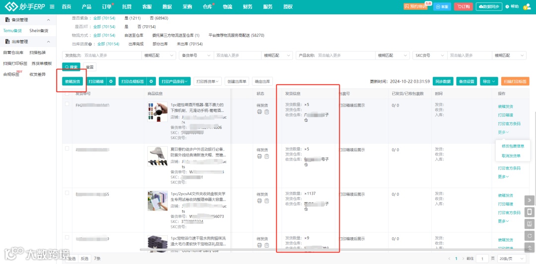 当发货单完成装箱贴标发出后,妙手支持勾选产品批量完成装箱发货,同时,同一批次的出库单支持更改物流信息;而紧急发货单发货后,同样支持按批次打印加急标识。