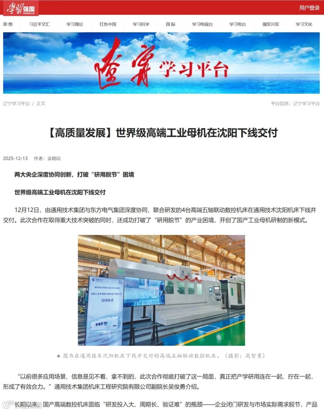 学习强国辽宁学习平台发布文章《【高质量发展】世界级高端工业母机在沈阳下线交付》,报道由通用技术集团与东方电气集团深度协同、联合研发的4台高端五轴联动数控机床在通用技术沈阳机床下线并交付。此次合作在取得重大技术突破的同时,还成功打破了“研用脱节”的产业困境,开创了国产工业母机研制的新模式。