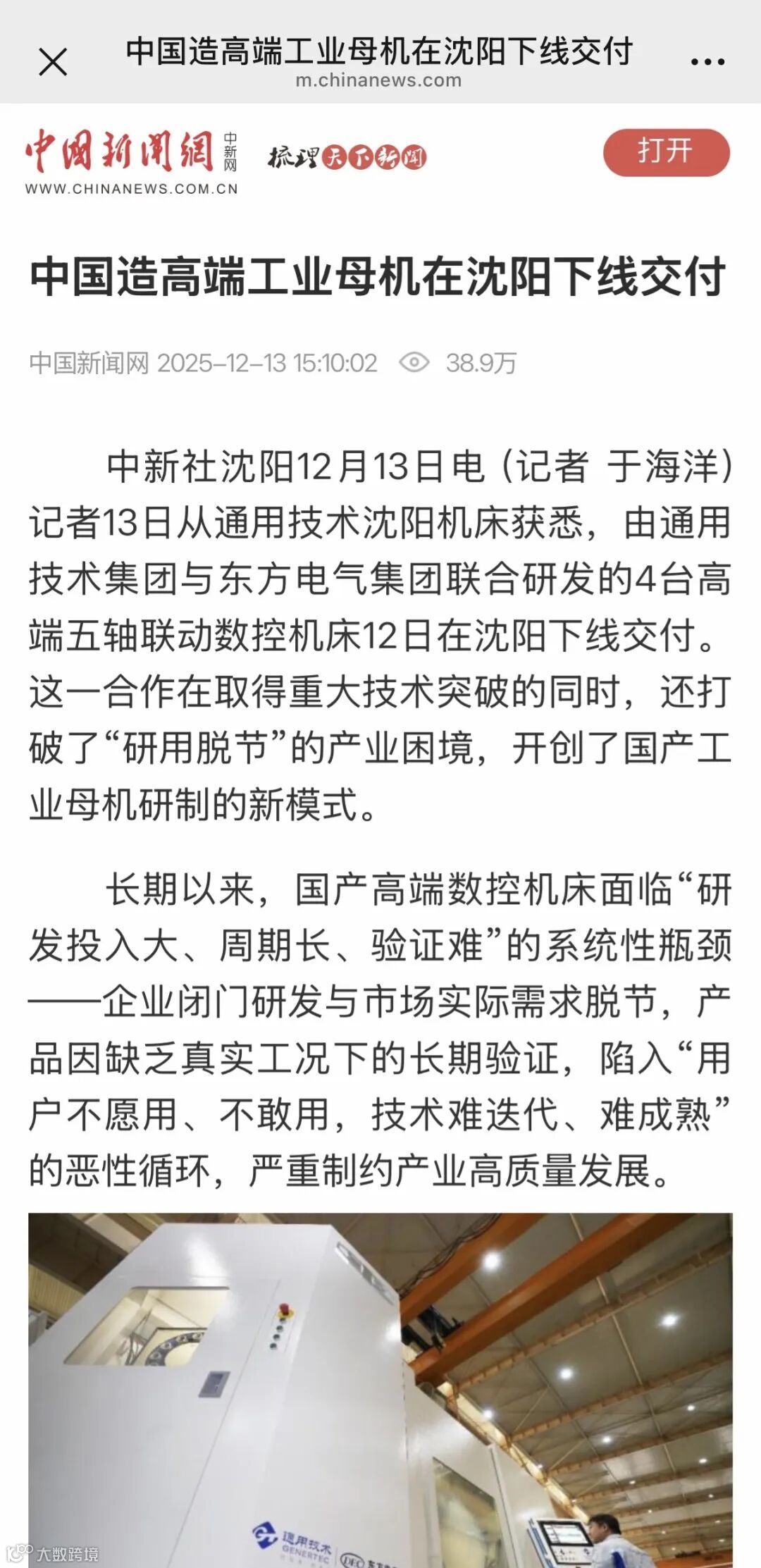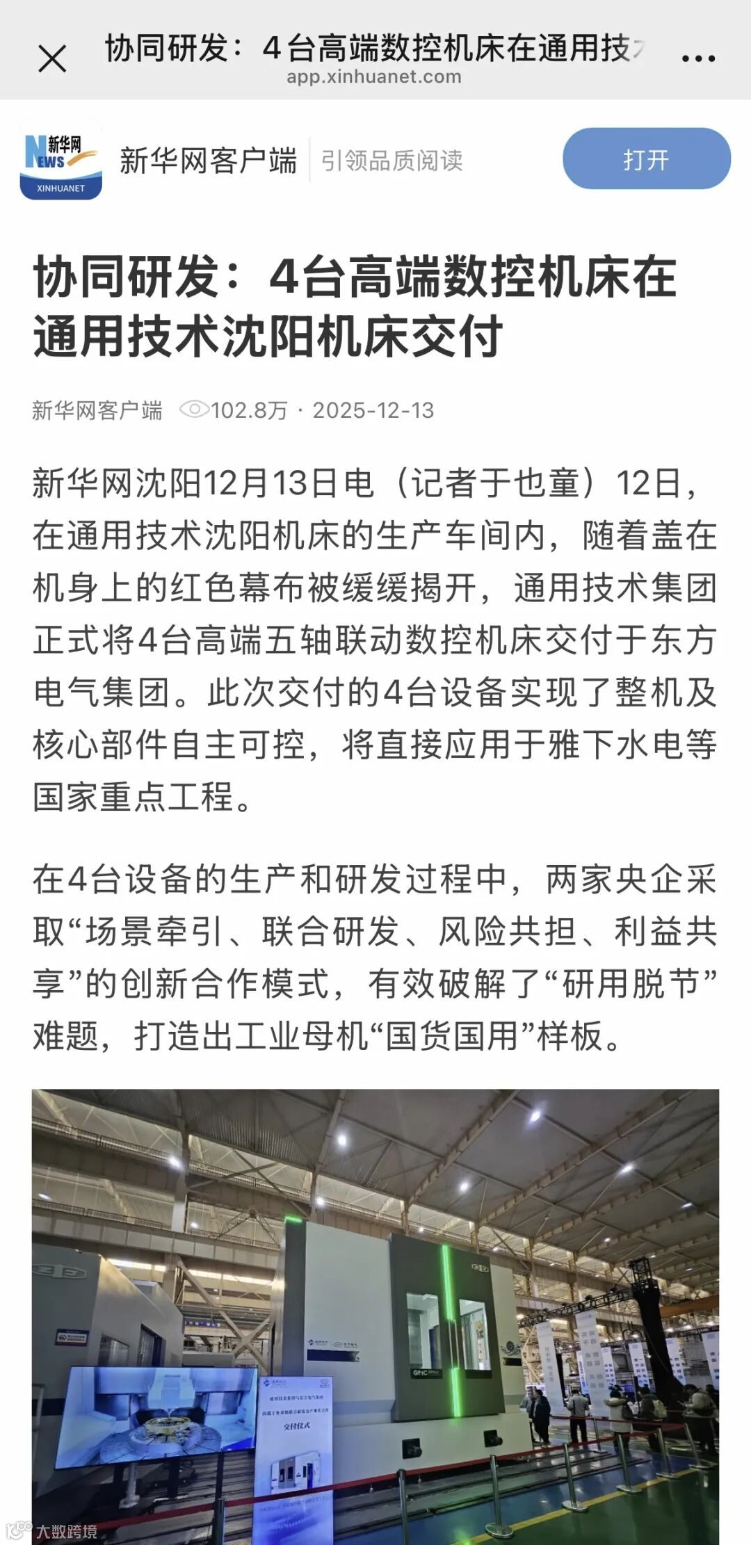 新华网客户端以《协同研发:4台高端数控机床在通用技术沈阳机床交付》为题,报道通用技术集团与东方电气集团探索新合作模式。东方电气集团主动向通用技术集团开放装备制造应用场景,通用技术集团依托机床产业布局,主攻核心技术及整机制造。