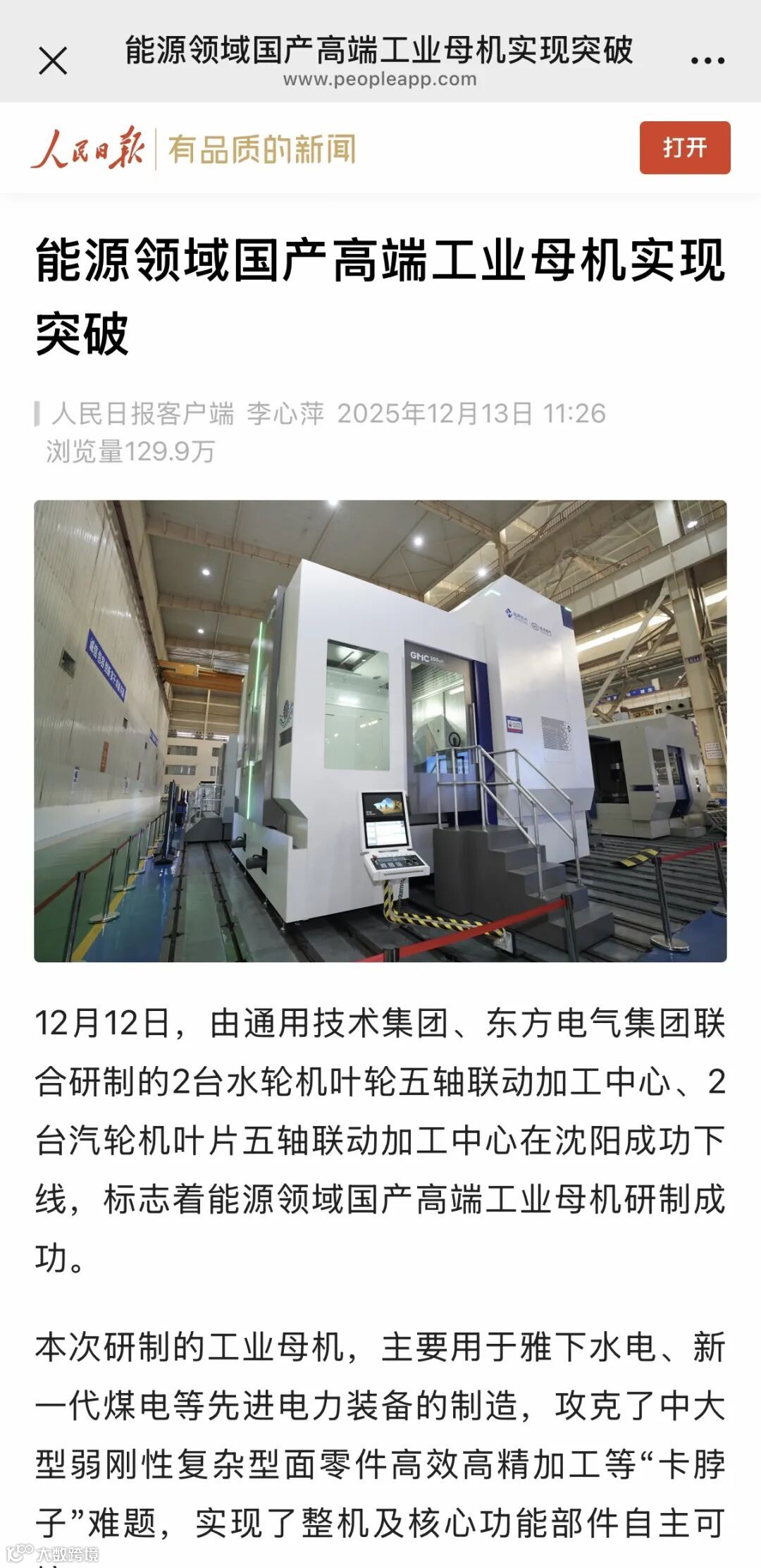 人民日报客户端以《能源领域国产高端工业母机实现突破》为题,报道通用技术集团联合东方电气集团,就能源装备制造典型应用场景,梳理高端工业母机应用需求,在“场景牵引、共同研发、风险共担、利益共享”原则下推动共同研发,推动工业母机“国货国用”、培育新质生产力。