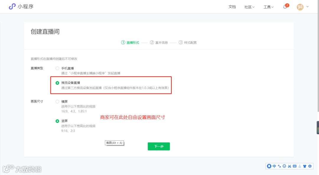 创建直播间 首先,第一步,直播形式勾选“推流设备直播”,按需求选择横屏/竖屏;