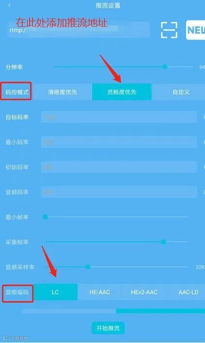码控模式、音频编码、横屏推流等。