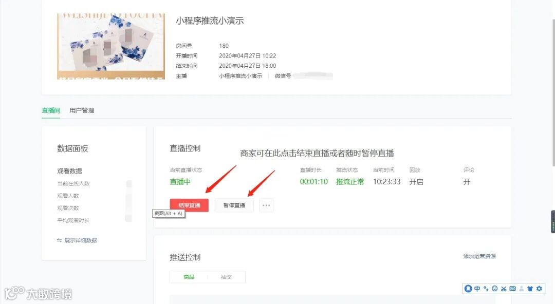 3.商家在推流结束后,左下角【数据面板】