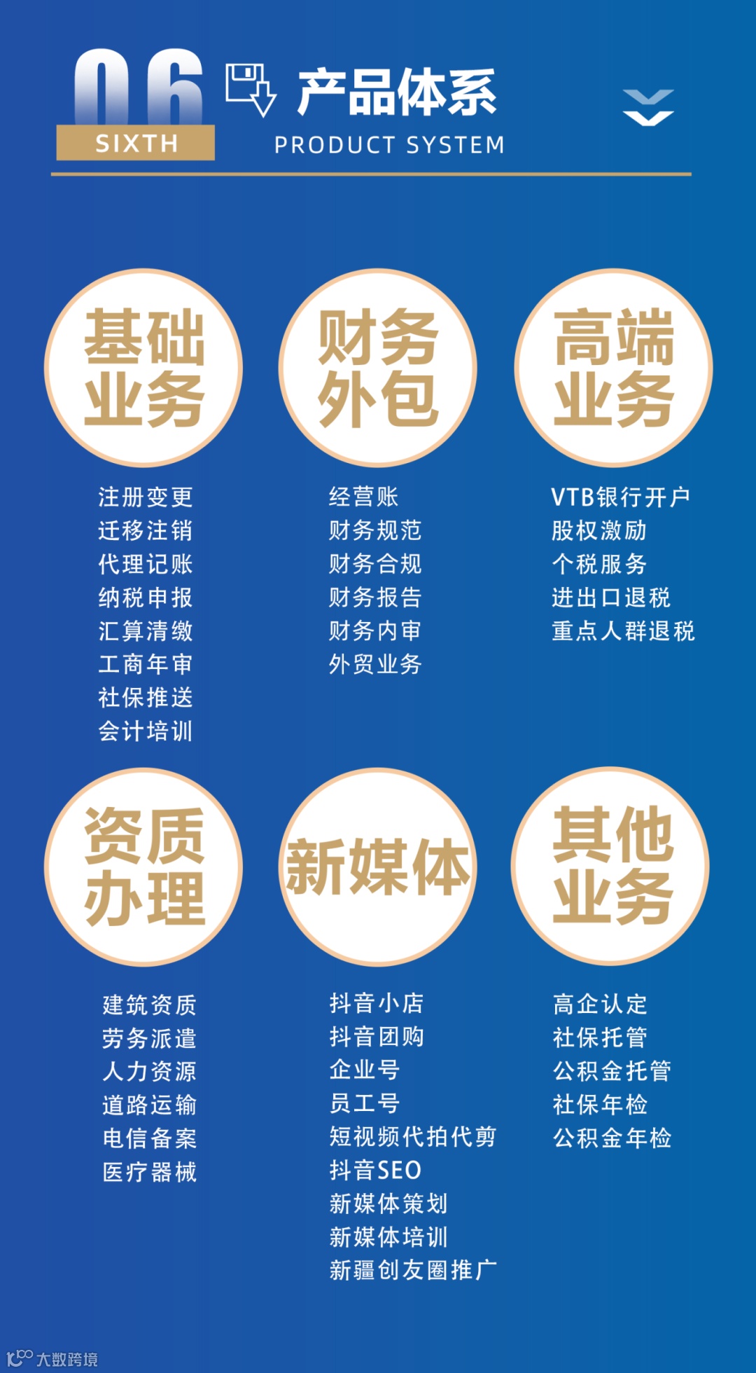 【基础业务】注册变更、迁移注销、代理记账、纳税申报、汇算清缴、工商年审、社保推送、会计培训等。