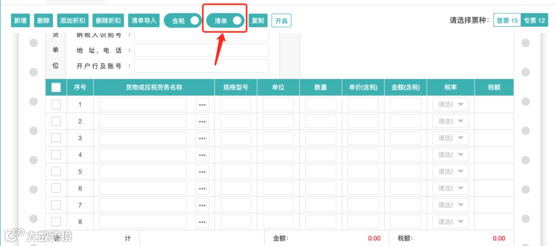 这个时候可能大家会有疑问,商品信息超过8项以后,还可以继续添加吗?当然可以,需要我们操作一下,就是打开我们开票界面的非清单按钮,使其变成清单模式。如下图所示: