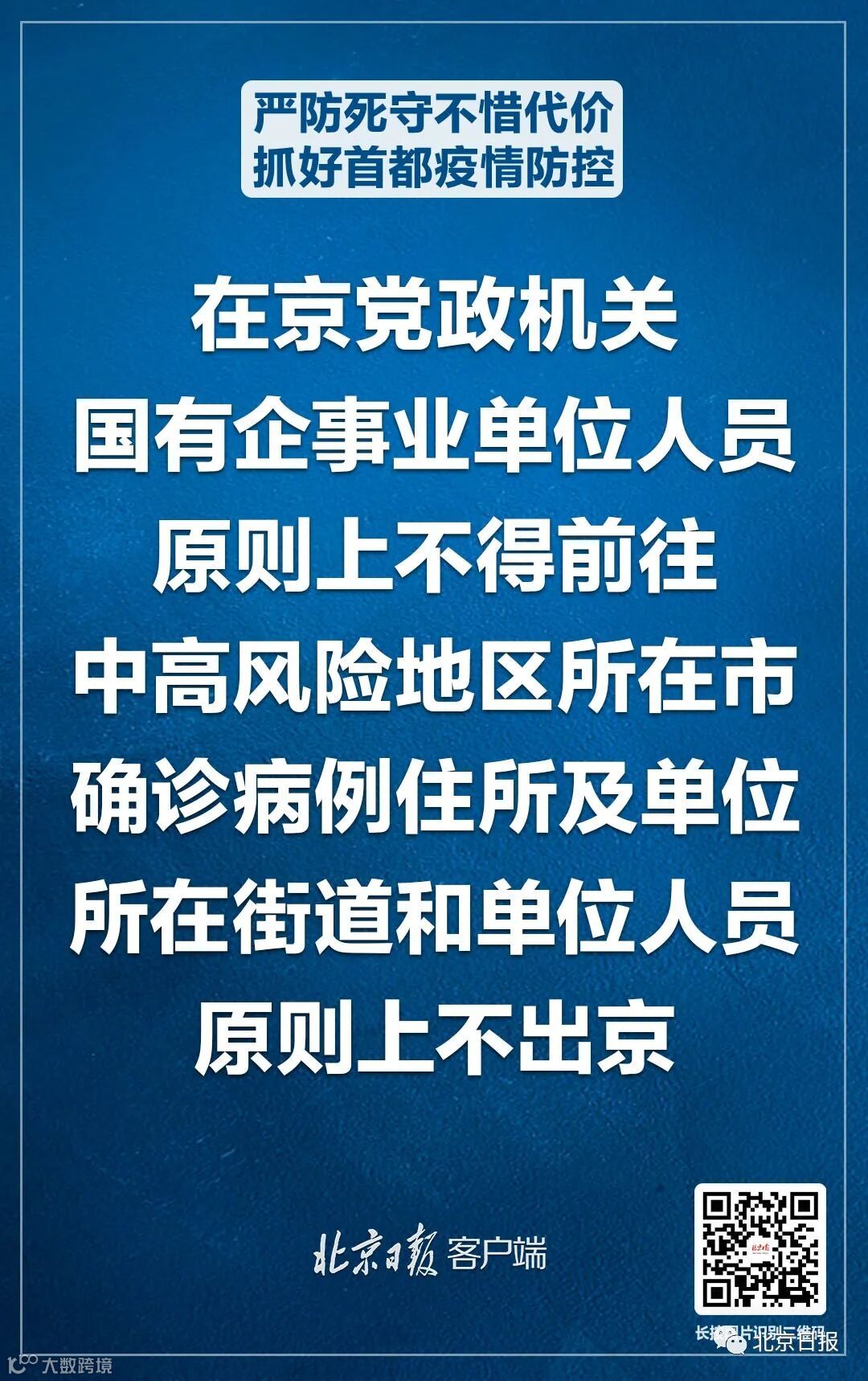 建议市民群众最大限度减少出京活动,近期不出京旅游,不前往境外、国内中高风险地区所在市(地级及以上城市,下同)。在京党政机关和国有企事业单位工作人员原则上不得前往中高风险地区及所在市,确须前往的,由所在单位严格审批管理,落实“谁申请、谁负责”“谁审批、谁负责”要求,返京后须立即进行核酸检测,结果阴性后方可返岗工作。已在中高风险地区所在市的出京人员,纳入当地管控的,在解除管控后持登机登车前48小时核酸检测阴性证明方可返京;未纳入管控的,在当地进行14天健康监测后,持登机登车前48小时核酸检测阴性证明方可返京。