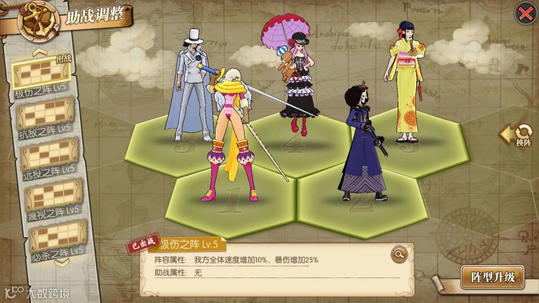 在抗敌之阵中,我们在站位上可选择1位年轻白胡子,3位新世界佩罗娜,4位英雄戈普,9位新世界马尔高,11位夏洛特·玲玲。