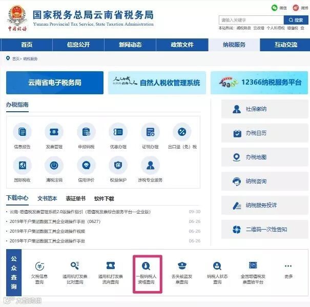 3.以“云南省”为例,点击“一般纳税人资格查询”,输入纳税人名称、税号或统一码和验证码,点击“提交”。