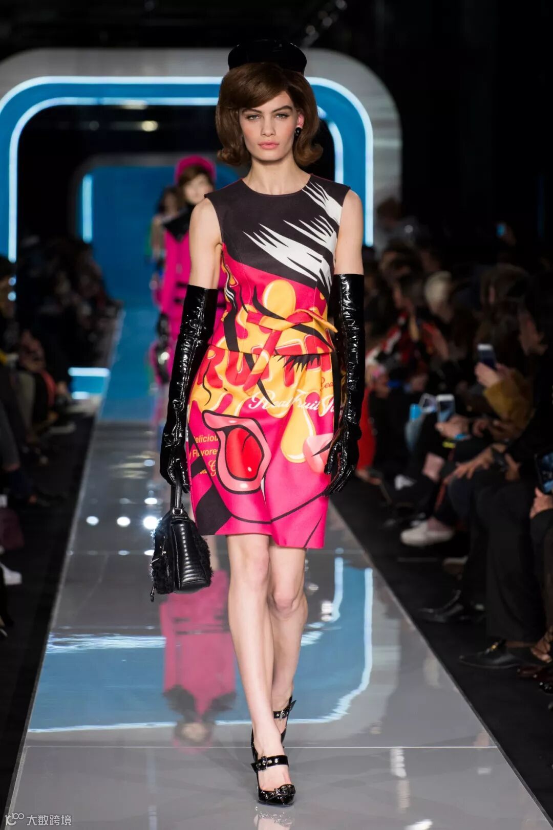 模特们顶着俏皮复古短发配以“彩色脸”,穿着明艳的套装、blingbling的礼服裙,上一秒好象打开了复古芭比的时髦衣橱,下一秒又穿回到摩登时代,满眼夸张人物插画配以糖果、麦片、气泡图案的连衣裙。也许这就是Moschino 不变的Chic套路!