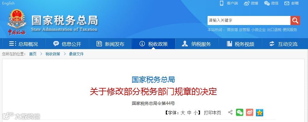 《国家税务总局关于修改部分税务部门规章的决定》,已经2018年6月5日国家税务总局2018年度第1次局务会议审议通过,现予公布,自公布之日起施行。