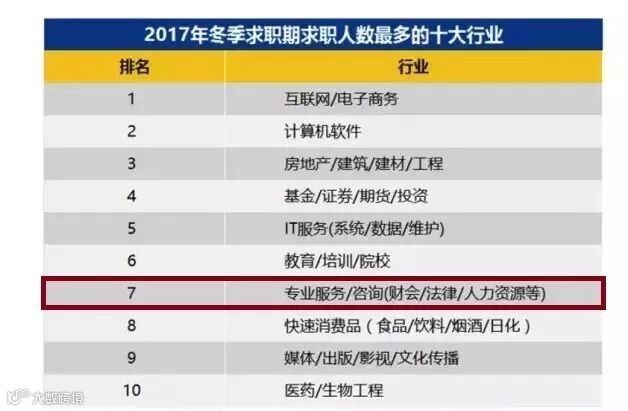 2017年冬季全国求职者投递简历最多的十个行业,专业服务/咨询(财会/法律/人力资源等)排在第七位