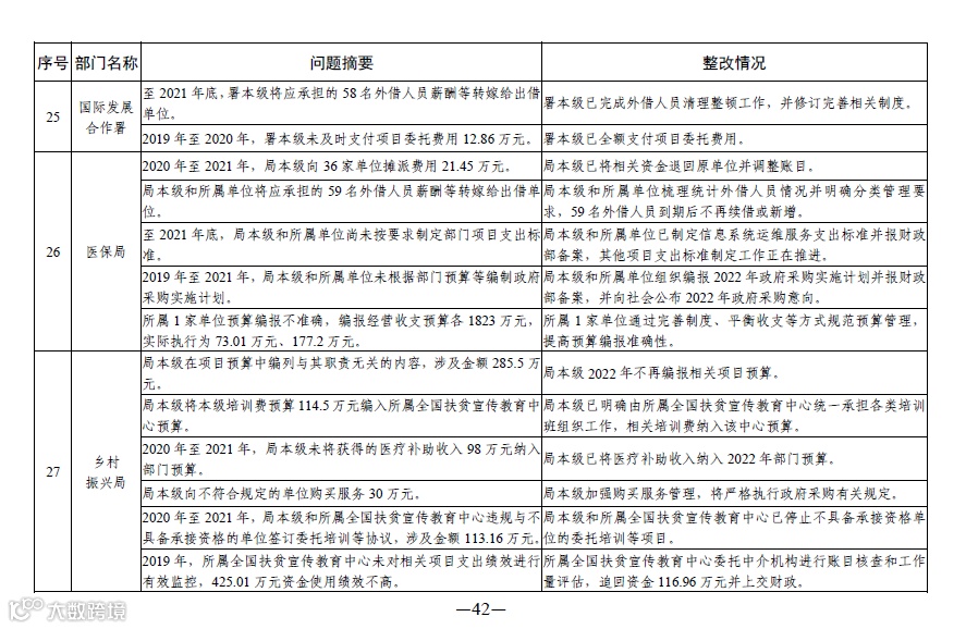 中央部门单位2021年度预算执行等审计查出问题的整改情况