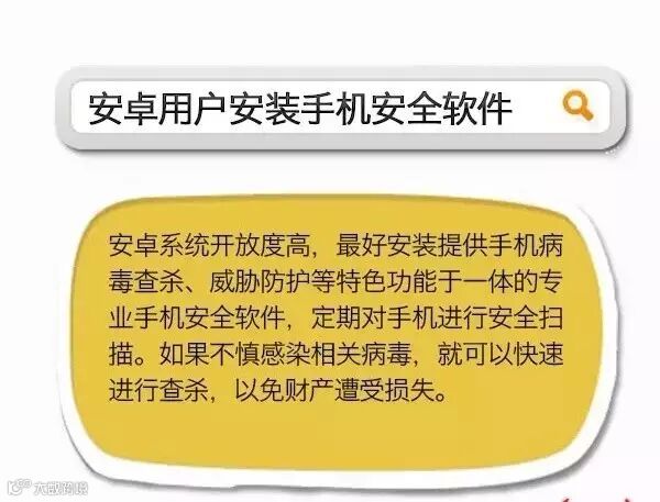 专家建议,用户不要轻易越狱iOS终端,也不要开启安卓终端的最高权限。因为,这意味着手机“不设防”,虽然一定程度上方便了用户,但更是为恶意代码的长驱直入打开了大门。同时,在下载安装手机软件时,最好直接从正规渠道进入,不要利用短信、网站、微博中的网址链接来下载安装应用。此外,需要时常进行手机流量监控。