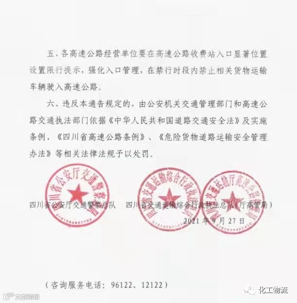 国庆限行:2021年9月30日12时至2021年10月7日24时,全省高速公路禁止危险化学品运输车辆通行。
