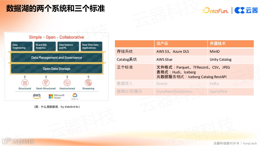 数据湖主要由两个系统组成:存储系统(如 AWS S3 等云存储及开源技术)和 catalog 系统(管理数据定义、结构、来源等元数据)。同时,它基于三个标准:文件格式(Parquet、TF record、CSV、JPEG 等)、表格式(Hudi、Iceberg 等)和元数据服务格式(如 Iceberg 的 RestAPI)。