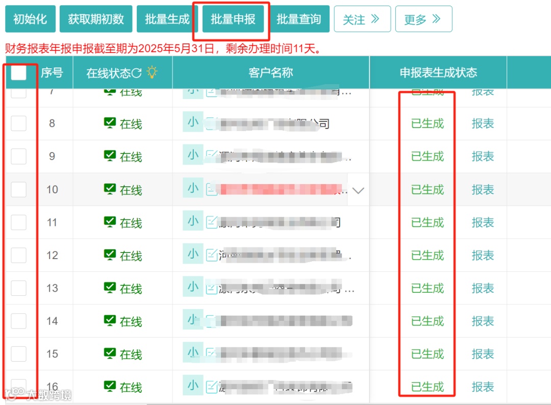 1.勾选需要申报的企业,先点击初始化、再获取期初数、接着依次点击批量取数、批量申报按钮;
