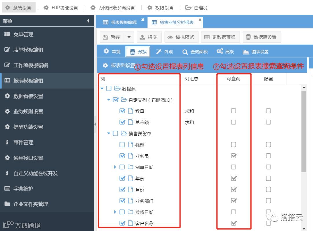 单据创建完成后,下一步配置销售业绩报表。如下图所示: