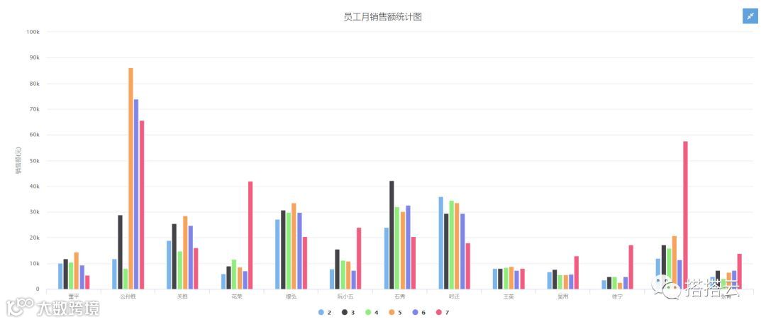 进入图表配置页面后,可根据不同维度,设置报表展现的图表,例如:根据不同的月份,不同的部门,统计汇总销售额,以柱状图显示;再比如按不同的区域,不同的产品,统计汇总销售额,并以曲线图展现;不同的业务场景,选择不同的维度、不同的图表进行统计展现,如下图所示: