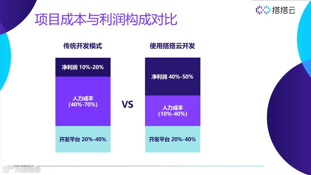 其次,基于搭搭云平台的创业风险低。在这个“唯快不破”的时代,快速响应客户需求、快速执行、快速变现的能力直接决定创业的成败。基于搭搭云平台创业,初期一般只需1至2人,在2个月甚至更短时间内,即可完成某一行业或细分行业标准化应用软件的搭建。之后,可再根据具体客户的不同需求进行调整,真正实现为每一位客户进行单独定制。这是典型小团队、低成本的精益创业。而传统软件开发模式下,同样的情况,则至少需要涵盖Web前端、iOS移动端、Android移动端和后端共计4名技术人员,从最初设计、编码到交付,再到后期迭代开发,到应用产品成熟稳定至少需要1年时间,创业成本高、产品开发周期长,从而导致了项目交付的极大不确定性。