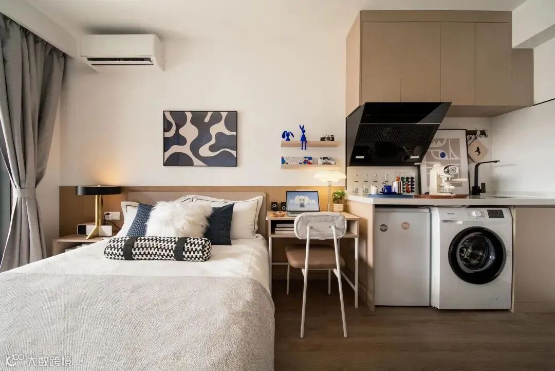 灵动的室内功能规划和充分的人性化设计是有巢公寓深圳桥头店户型设计中的重要亮点。在建筑面积约30㎡的开间户型中,设计师将生活景观阳台合二为一,并将寝卧模块、社交模块、厨房模块以功能独立划分,既能明确功能边界,又能保持空间流动性,提供了开放与灵活的居住体验。