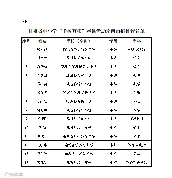 根据省教育厅《关于举办甘肃省中小学“千校万师”赛课活动的通知》,省级赛课于12月份进行,赛课活动涉及小学、初中、普通高中3个学段42个学科,省教育厅分配全市参赛名额60名。依据2023年市级赛课结果,拟推荐42个学科中获得第一名的教师和其中18个学科中获得第二名的教师参加甘肃省中小学“千校万师”赛课活动。现将参赛名单予以公示。公示期间,如有异议,请实名向市教育局反映。