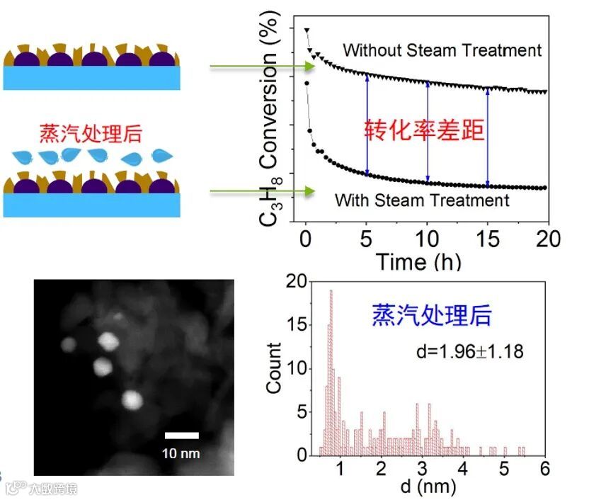 而在实际使用环境中,如何长时间保证催化剂性能以及选择性是重要的课题。在此项研究中,使用 700℃ 高温水蒸汽对样品进行预处理,从而模拟工程使用条件,加速催化剂的老化。在经过水蒸汽处理后的样品,活性 Pt 颗粒粒径明显增大,同时丙烷的转化率也发生明显下降。