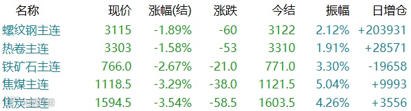 今日黑色系全线下跌,钢材现货价格以跌为主,整体成交偏弱。从基本面看,房地产市场仍在调整阶段,终端需求偏弱,而建筑钢材产量回升,库存有所累积,钢市供需压力加大;原燃料方面,随着钢厂效益下滑,叠加北方高炉环保限产,近日铁矿石、双焦承压下跌,今日焦炭开启第一轮提降,钢材成本支撑有所减弱;综合看,短期利空因素较多,导致钢价震荡下行,考虑到旺季将至,加上地产政策预期较强,钢价向下空间或有限。预计明日钢价持稳个跌,幅度0-10。