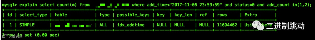 select count(*)from table where add time<"2017- 11-0623:59:59" and status=0 add count in(1,2) ORDER BY id ASC;